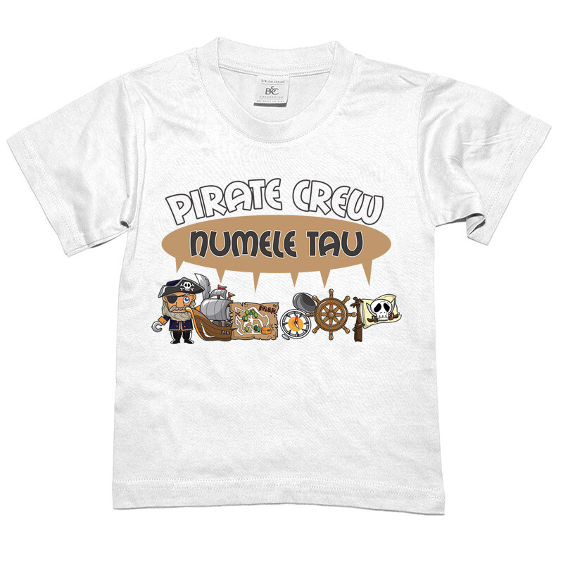 Tricou sau body personalizat pentru copii, cu imprimeu cu pirati, cadoul perfect pentru o petrecere aniversara, cu desen imprimat digital, direct in tesatura tricoului, cu vopsele pe baza de apa, fara potential alergen. Toate produsele sunt din bumbac 100%.
