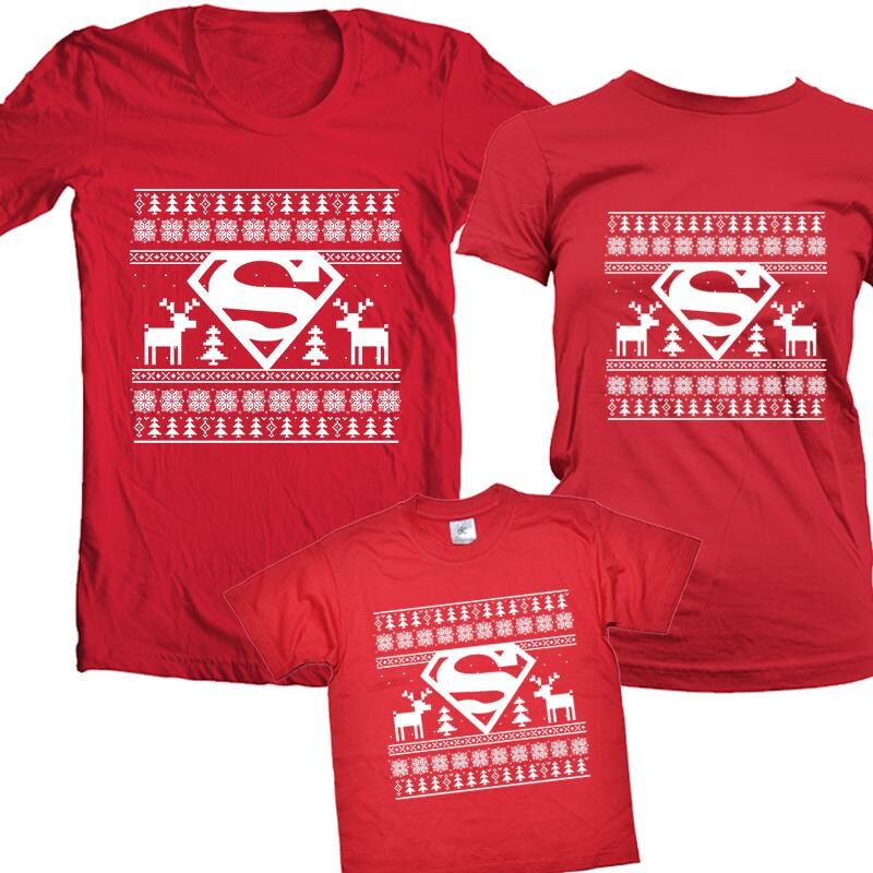 Set de tricouri rosii asortate de Craciun cu imprimeu specific de Craciun care imita puloverele traditionale.