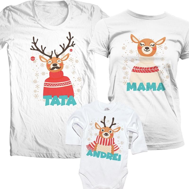 Set personalizat pentru familia de 3 persoane pentru Craciun cu reni. Tricourile personalizate se pot folosi pentru sedinte foto sau pentru a adauga savoare unei petreceri de Craciun. Se personalizeaza cu numele copilului.