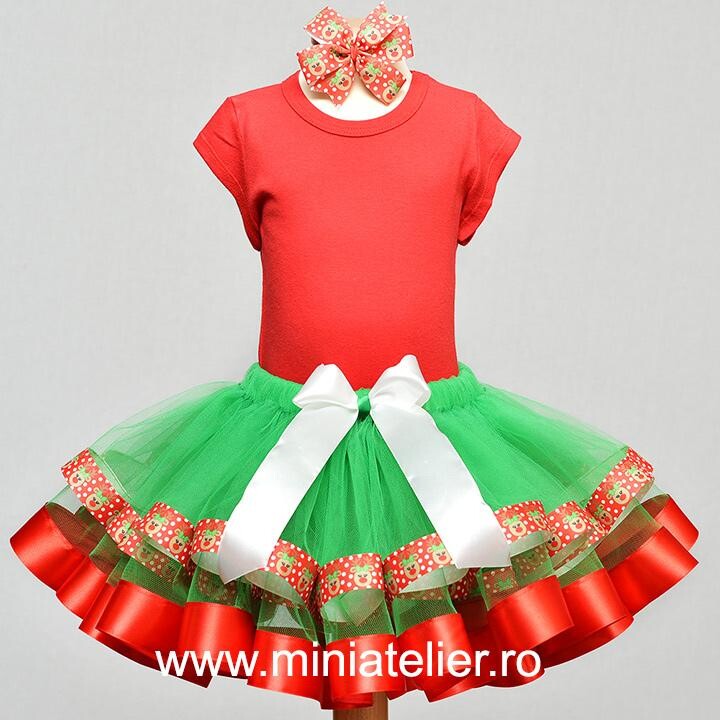 Fustita tutu din tulle pemntru Craciun cu satin rosu si banda decorativa cu reni. Aceasta este pe elastic, din tul foarte moale, de calitate superioara, ales special ca sa nu incomodeze fetita in nici un fel. Talia este elastica si acoperita cu satin si lungimea este in general calculata acopere jumatate din pulpa piciorului, in asa fel incat, in momentul in care se umfla din cauza miscarii, sa fie o fustita mini Fustitele sunt accesorizate cu benzi colorate, tematice