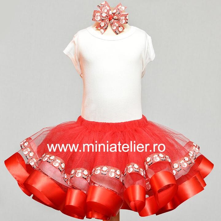Fustita tutu din tulle pemntru Craciun cu satin rosu si banda decorativa cu Mos Craciun si omuleti de zapada. Aceasta este pe elastic, din tul foarte moale, de calitate superioara, ales special ca sa nu incomodeze fetita in nici un fel. Talia este elastica si acoperita cu satin si lungimea este in general calculata acopere jumatate din pulpa piciorului, in asa fel incat, in momentul in care se umfla din cauza miscarii, sa fie o fustita mini Fustitele sunt accesorizate cu benzi colorate, tematice