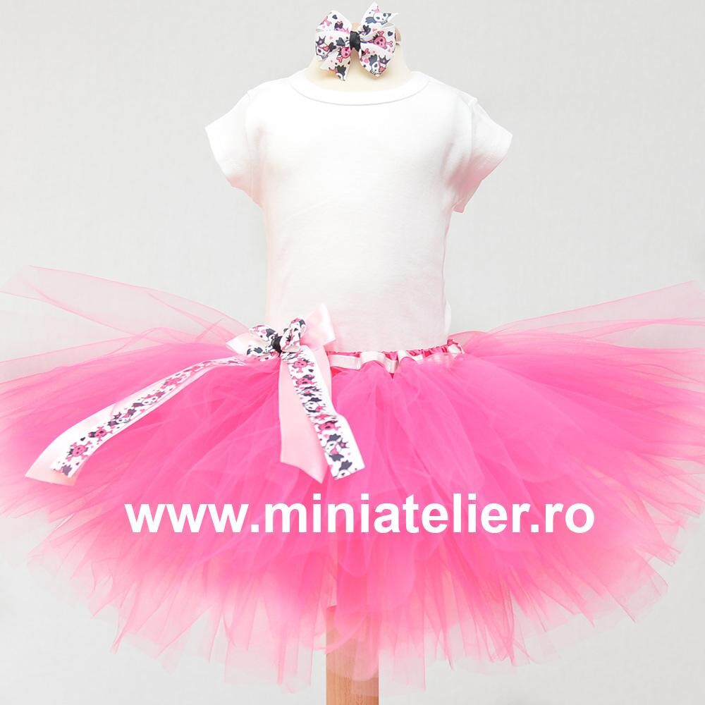 Fustita tutu este pe elastic, din tul foarte moale, de calitate superioara, ales special ca sa nu incomodeze fetita in nici un fel. Talia este elastica si acoperita cu satin si lungimea este in general calculata acopere jumatate din pulpa piciorului, in asa fel incat, in momentul in care se umfla din cauza miscarii, sa fie o fustita mini Fustitele sunt accesorizate cu benzi colorate, tematice
