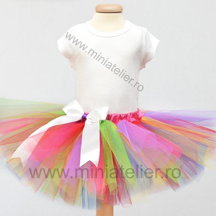 Fustita tutu este pe elastic, din tul foarte moale, de calitate superioara, ales special ca sa nu incomodeze fetita in nici un fel. Talia este elastica si acoperita cu satin si lungimea este in general calculata acopere jumatate din pulpa piciorului, in asa fel incat, in momentul in care se umfla din cauza miscarii, sa fie o fustita mini Fustitele sunt accesorizate cu benzi colorate, tem[...]