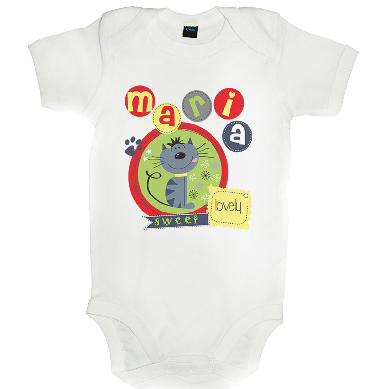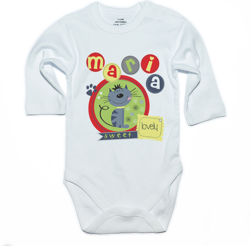 Tricou sau body personalizat pentru copii, cu imprimeu personalizat cu numele copilului si pisici ,cadoul perfect pentru o petrecere aniversara, cu desen imprimat digital, direct in tesatura tricoului, cu vopsele pe baza de apa, fara potential alergen. Toate produsele sunt din bumbac 100%.