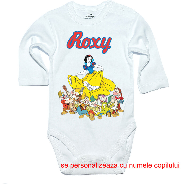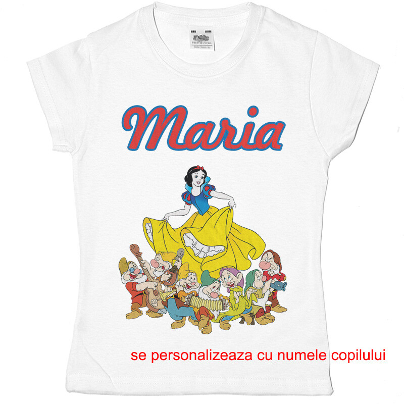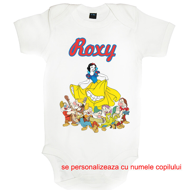 Tricou sau body personalizat pentru copii, cu imprimeu cu Alba ca zapada ,cadoul perfect pentru o petrecere aniversara, cu desen imprimat digital, direct in tesatura tricoului, cu vopsele pe baza de apa, fara potential alergen. Toate produsele sunt din bumbac 100%.