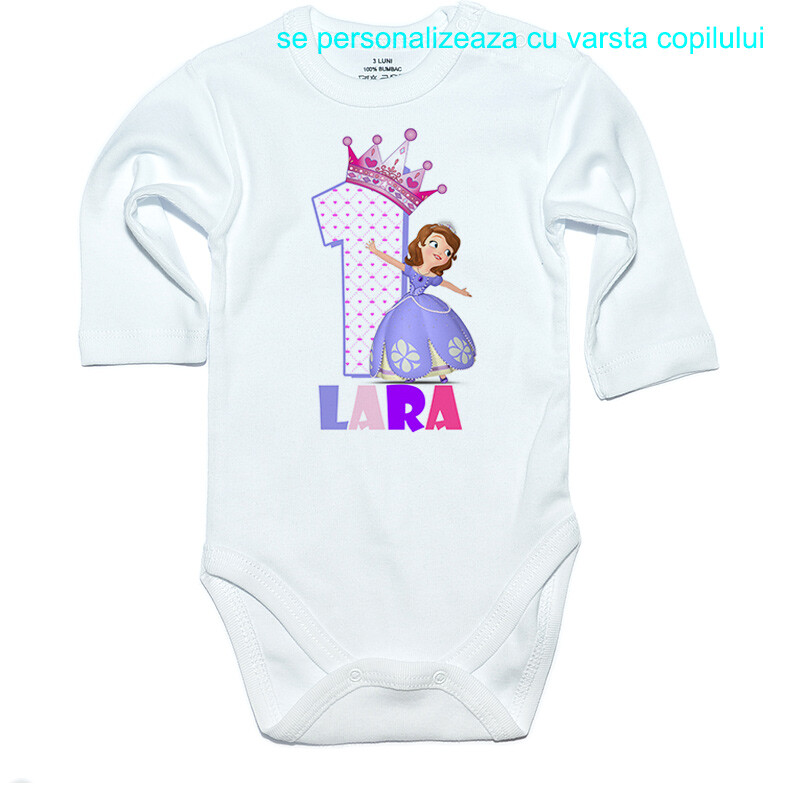 Tricou sau body personalizat pentru copii, cu imprimeu Sofia intai ,cadoul perfect pentru o petrecere aniversara, cu desen imprimat digital, direct in tesatura tricoului, cu vopsele pe baza de apa, fara potential alergen. Toate produsele sunt din bumbac 100%.
