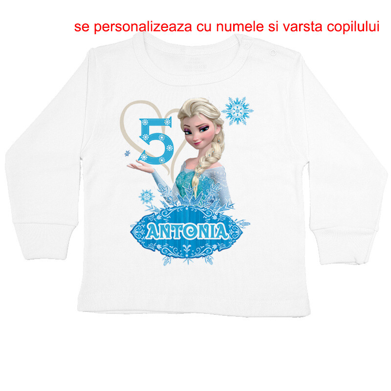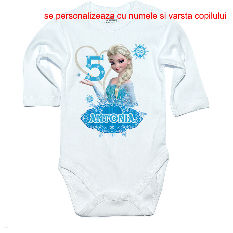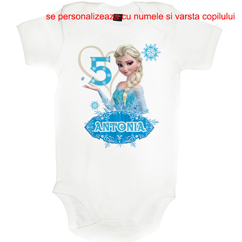 Tricou sau body personalizat pentru copii, cu imprimeu cu printesa de gheata, cadoul perfect pentru o petrecere aniversara, cu desen imprimat digital, direct in tesatura tricoului, cu vopsele pe baza de apa, fara potential alergen. Toate produsele sunt din bumbac 100%.