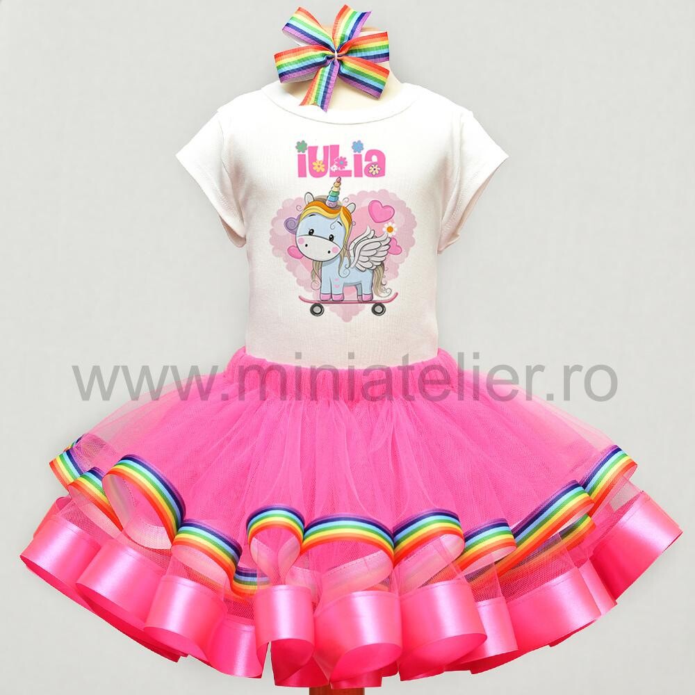 Set aniversar cu fustita din tulle cu satin si o banda multicolora si body sau tricou din bumbac 100% imprimat digital cu un unicorn simpatic si numele fetitei Dvs.