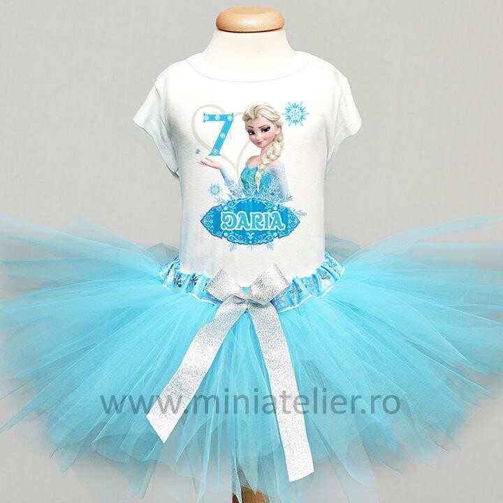 In talie tutu-ul acesta are o banda bleu cu fulgi de nea argintii, asortata cu desenul tricoului.