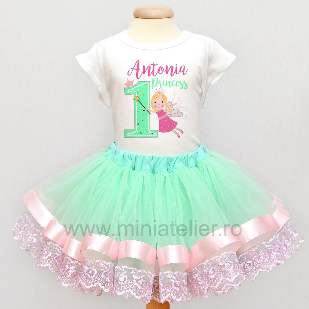 Fustita este din tulle verde menta cu banda din satin roz deschis si dantela roz. Fustita este captusita.