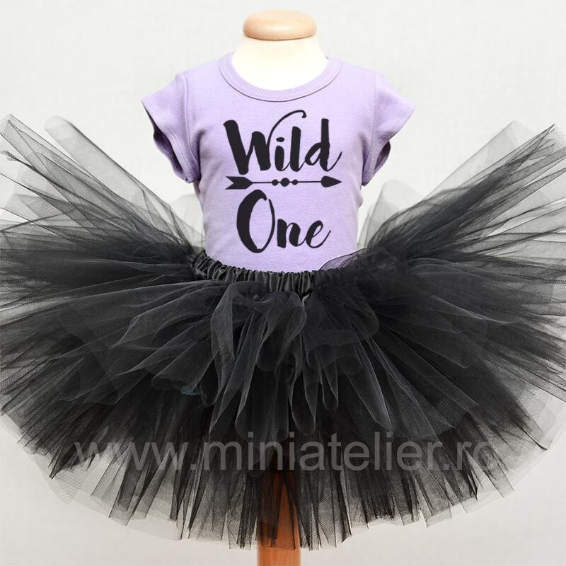 Set aniversar format din tricou violet si fustita tutu neagra dubla, extrem de bogata. Tricourile disponibile in stoc sunt disponibile doar pentru varsta de 1 an (12-18 luni). In cazul in care este necesara o marime mai mica sau mai mare pentru tricou, putem modifica culoarea tricoului sau body-ului (rosu, roz, etc)