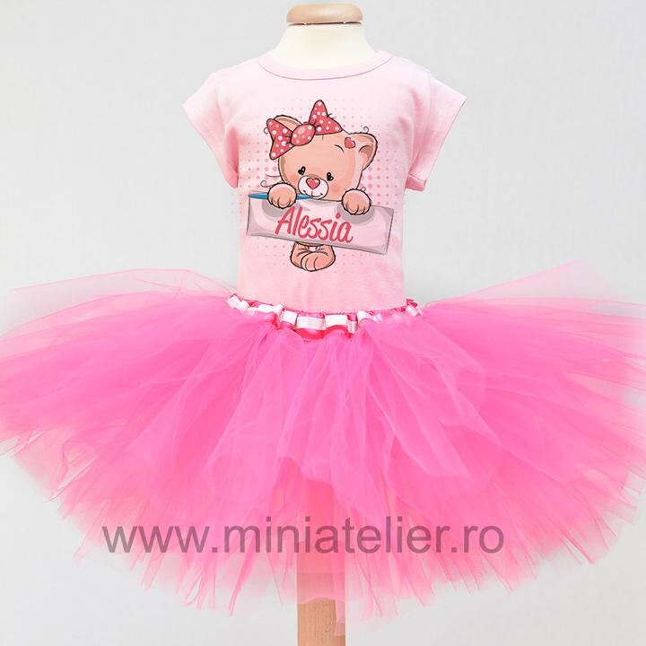 Compleu tricou sau body si fustita tutu cadoul perfect pentru aniversare cu body din bumbac 100% imprimat cu un ursulet care tine numele copilului si un tutu foarte fluffy in culori asortate.