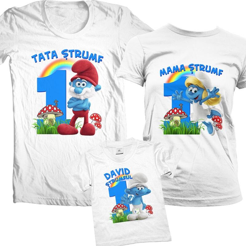 Set personalizat pentru familia de 3 persoane cu un sarbatorit si tematica petrecerii cu strumfi.