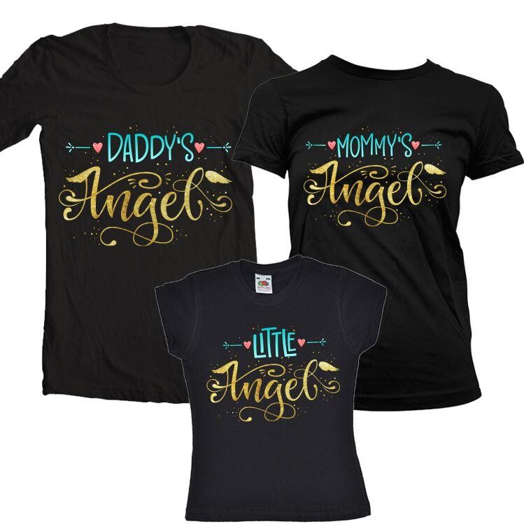Set de tricouri pentru familie aniversar cu tematica LITTLE ANGEL. Se pot folosi pentru o sedinta foto sau cadou pentru aniversare. Tricourile sunt de calitate superioara, din bumbac 100%, grosime medie (190 grame tricourile barbatesti si aproximativ 140-160 cele de femei si copii).
