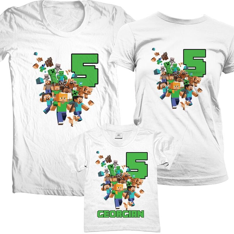Set de tricouri pentru familie aniversar cu tematica MINECRAFT. Se pot folosi pentru o sedinta foto sau cadou pentru aniversare. Tricourile sunt de calitate superioara, din bumbac 100%, grosime medie (190 grame tricourile barbatesti si aproximativ 140-160 cele de femei si copii).