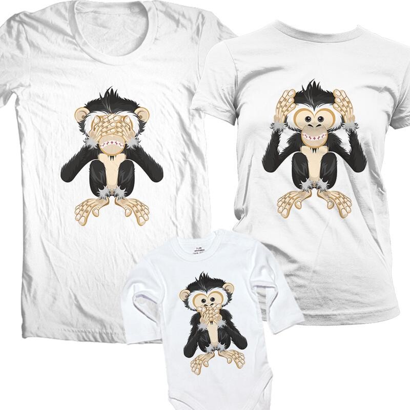 Set personalizat pentru familia de 3 persoane cu maimutele intelepte. Tricourile personalizate se pot folosi pentru sedinte foto