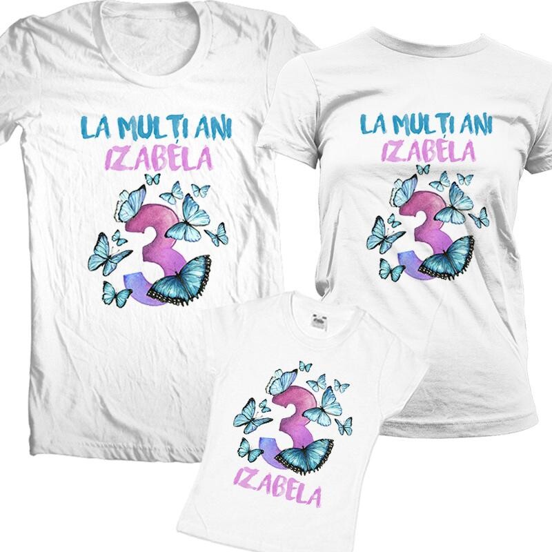 Set personalizat pentru familia de 3 persoane cu o sarbartorita . Tricourile personalizate pentru aniversare se pot folosi pentru sedinte foto sau pentru a adauga savoare unei petreceri aniversare.