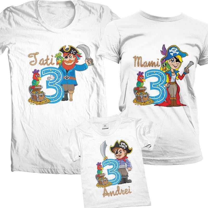 Set personalizat pentru familia de 3 persoane cu tema pirati. Tricourile personalizate pentru aniversare se pot folosi pentru sedinte foto sau pentru a adauga savoare unei petreceri aniversare.