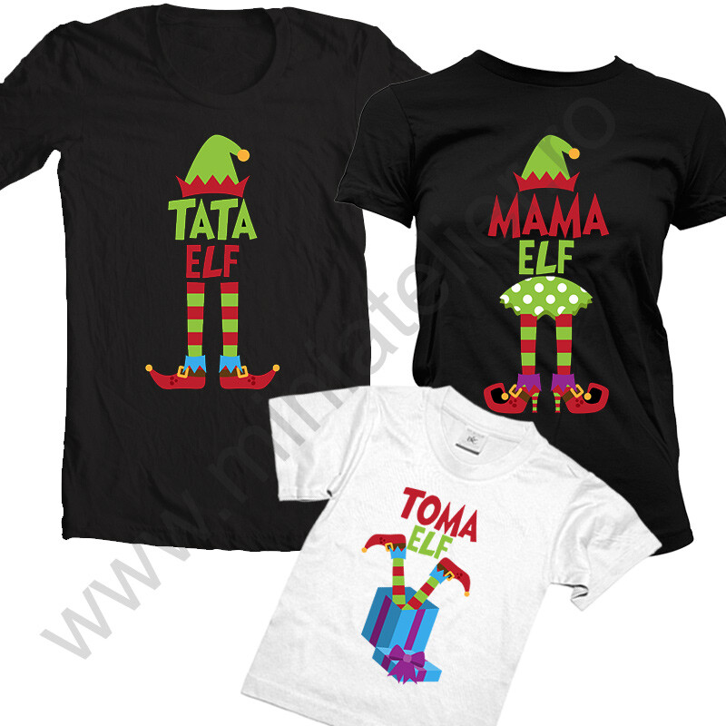 Set de tricouri pentru familie de Craciun. Se pot folosi pentru o sedinta foto sau cadou pentru Craciun. Tricourile sunt de calitate superioara, din bumbac 100%, grosime medie (190 grame tricourile barbatesti si aproximativ 140-160 cele de femei si copii).